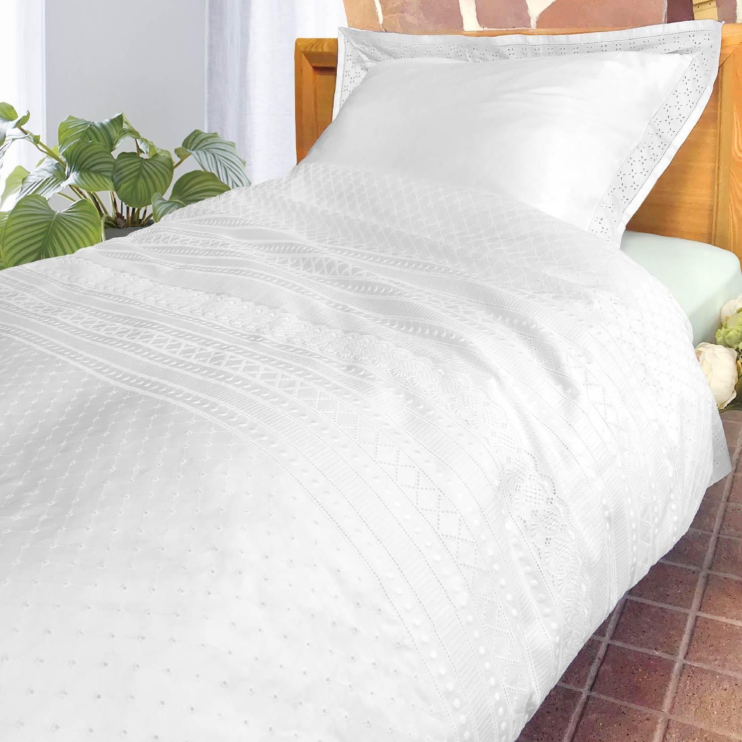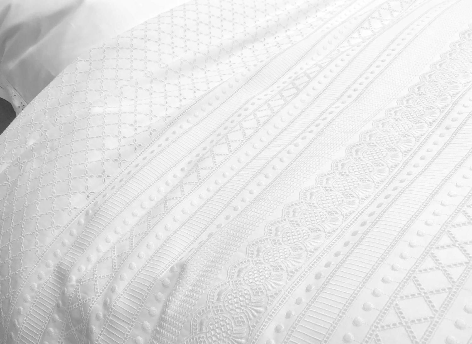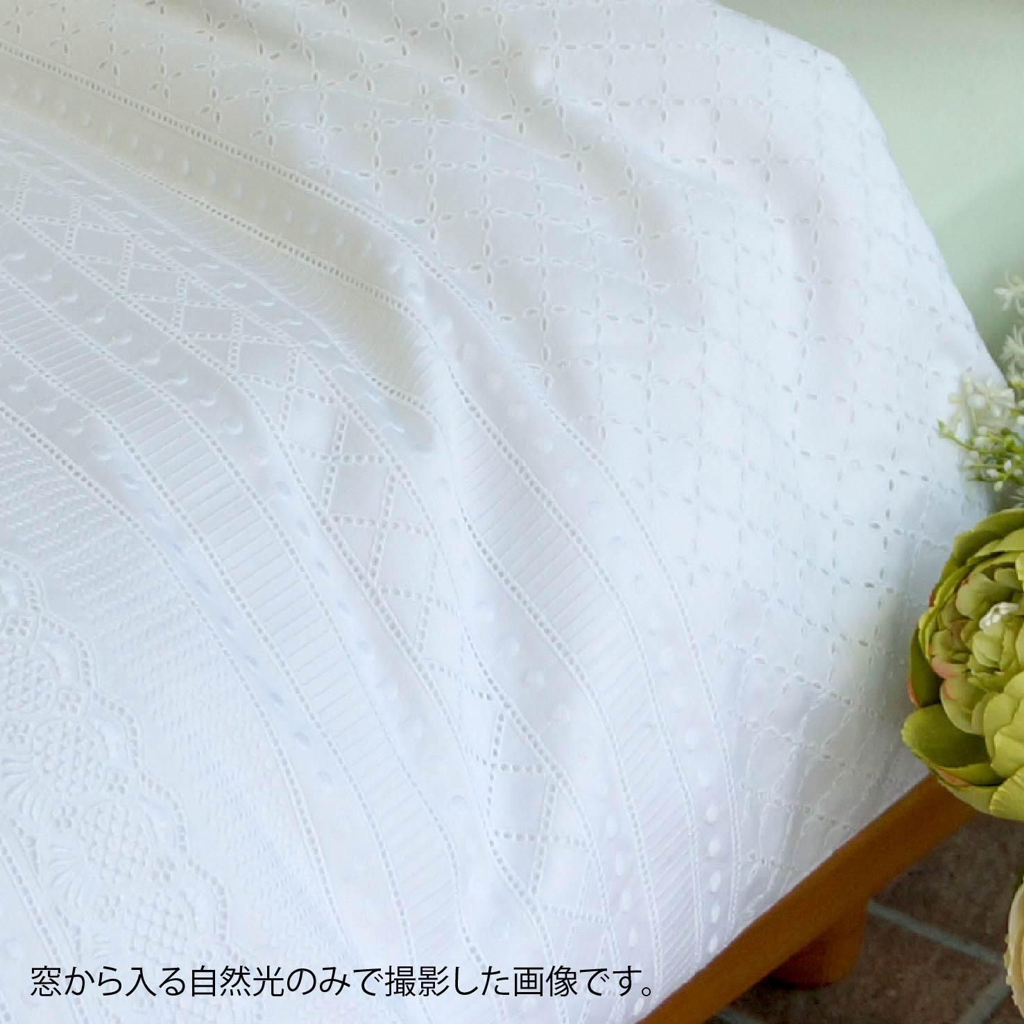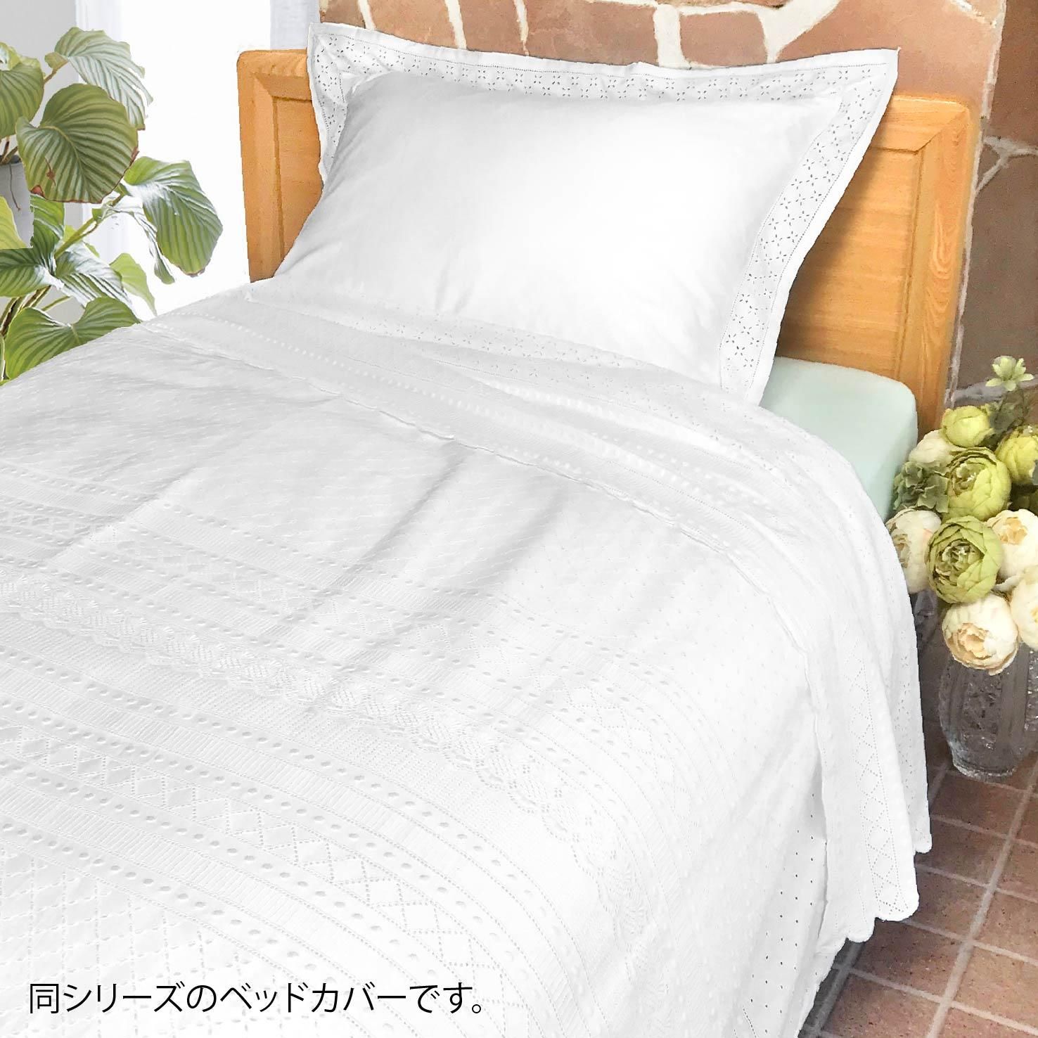 小さな雪の結晶が降り積もり、日の光できらきらと輝いている雪景色のような、清らかなイメージの純白レースのカバーです。上質な綿100%のサテン地に、ヨーロピアンテイストのオリジナルデザインの刺繍を施し、格調高いレースに仕上げています。