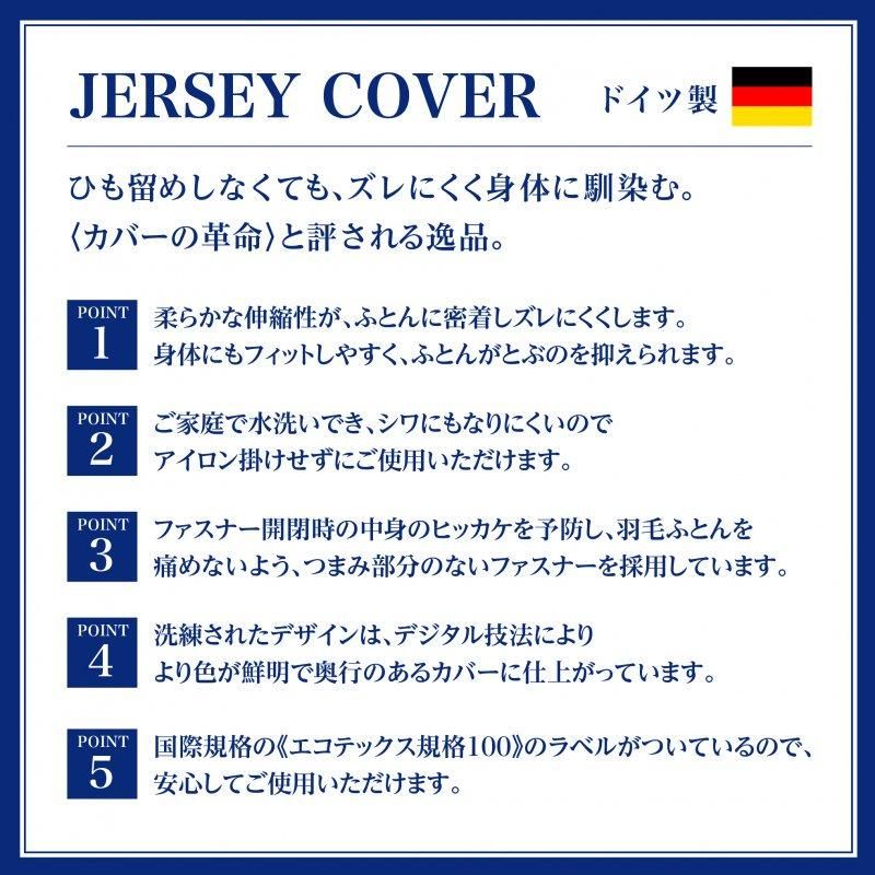 ジャージー素材ならではの柔らかな伸縮性があるため、ふとんにピタッと吸い付くように密着します。 そのため、ふとんとカバーがずれにくく、ひも留めする必要がありません。 身体にもフィットしやすく、ふとんとの密着性を高めてくれるため、 ベッドからふとんや毛布がずり落ちるのを予防してくれます。